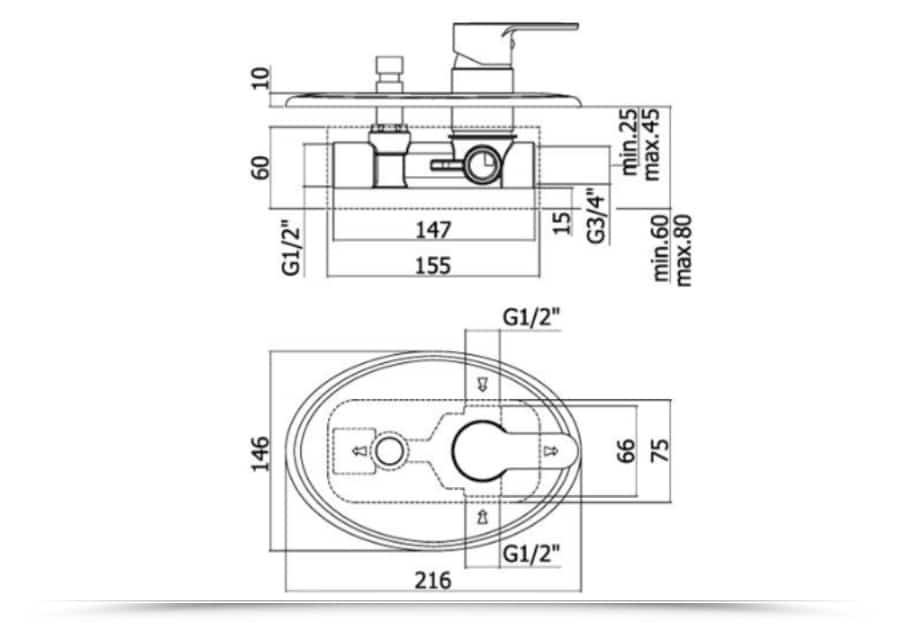 Questo miscelatore a muro presenta anche una piastra ovale di dimensioni 146×216 mm. La serie BLU garantisce anche la massima disponibilità di parti di ricambio, in grado di garantire lunga durata al tuo set di rubinetteria.